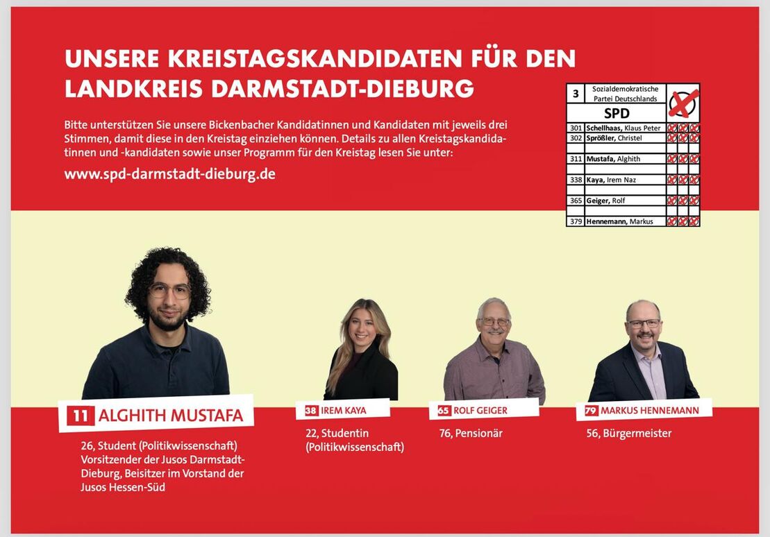Mit dem vielversprechenden Listenplatz 11 wird Alghith Mustafa (Jusos) die Interessen der Bickenbacher Bevölkerung bestmöglichst vertreten.