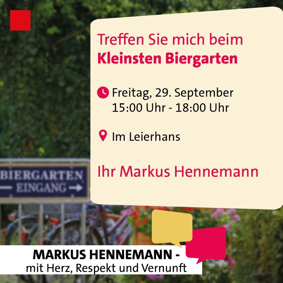 Treffen Sie unseren Bürgermeister Markus Hennemann und unsere Landtagsabgeordnete Heike Hofmann zum Gespräch im kleinsten Biergarten Bickenbachs.