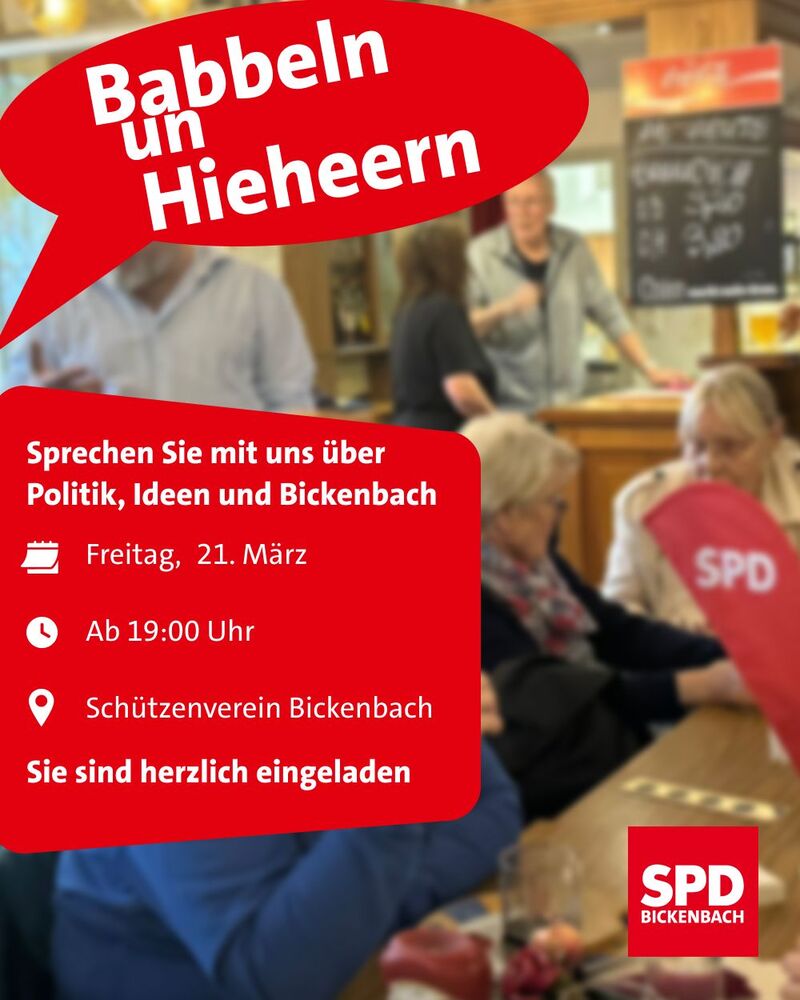 Sie sind herzlich eingeladen, dort mit uns über die Politik in Bickenbach und darüber hinaus ins Gespräch zu kommen.