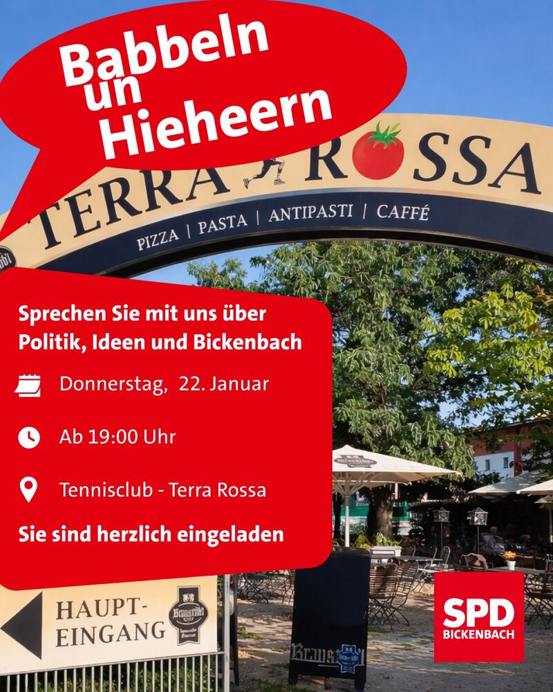 Sie sind herzlich eingeladen, dort mit uns über die Politik in Bickenbach und darüber hinaus ins Gespräch zu kommen.