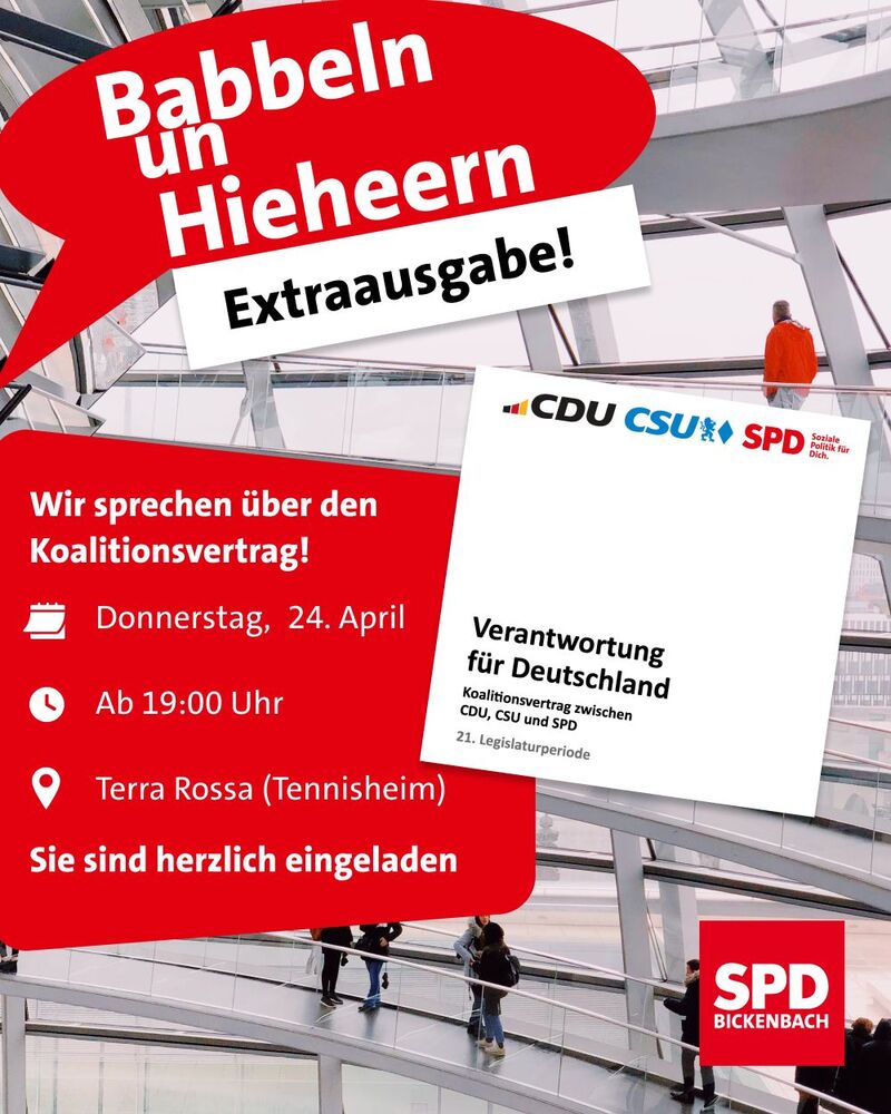Wir sprechen über den Koalitionsvertrag von Union und SPD für die kommende Bundesregierung. Sie sind herzlich eingeladen, dort mit uns darüber ins Gespräch zu kommen.