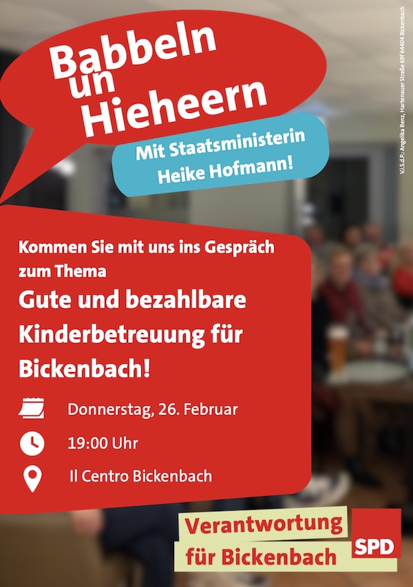 Bei unserem monatlichen Stammtisch „Babbeln un Hieheern“ begrüßen wir dieses Mal die Hessische Ministerin für Arbeit, Integration, Jugend und Soziales, Staatsministerin Heike Hofmann. Gemeinsam wollen wir über Perspektiven und konkrete Verbesserungen für die Betreuung im Krippen- und Ü3-Bereich in Bickenbach sprechen.