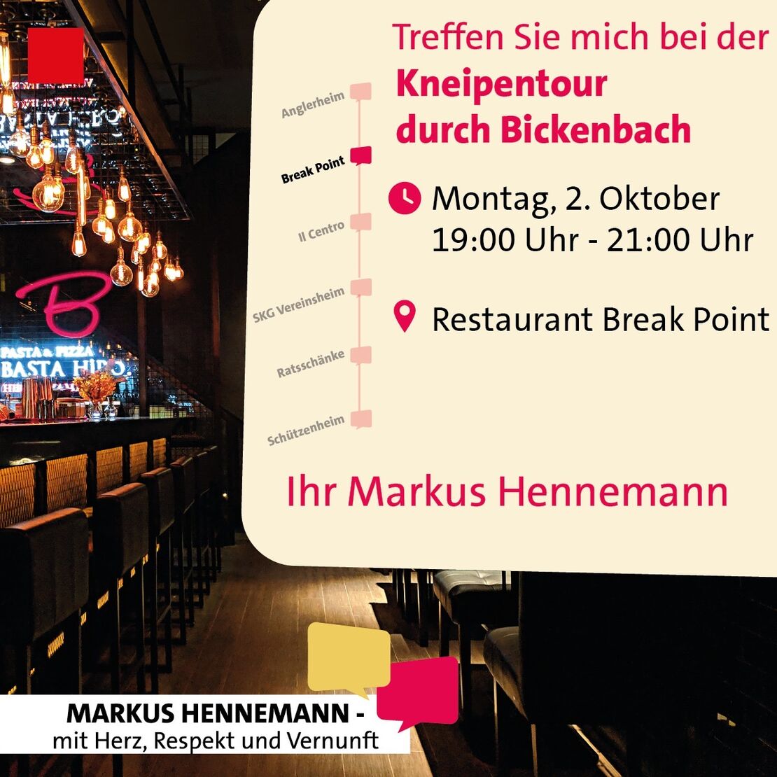 Treffen Sie mich diese Woche bei meiner "Kneipen-Tour" jeden Abend in einem anderen Bickenbacher Restaurant. Heute geht es weiter