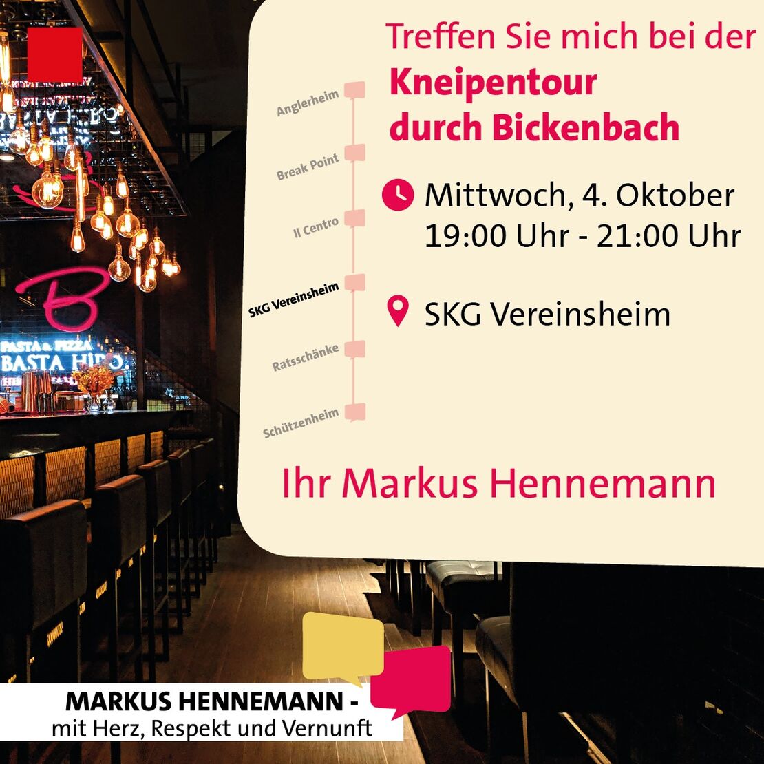 Treffen Sie mich diese Woche bei meiner "Kneipen-Tour" jeden Abend in einem anderen Bickenbacher Restaurant. Heute geht es in die vierte Runde