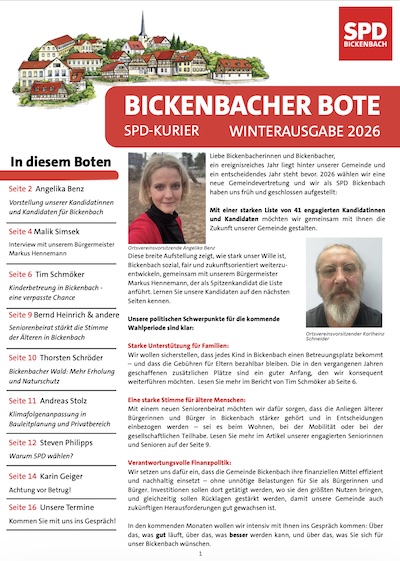 Der neue Bickenbacher Bote ist online und auch schon bald in Ihrem Briefkasten. Aus dem Inhalt: