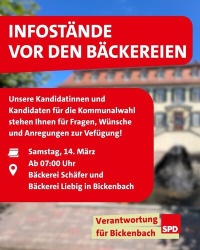 Treffen Sie Ihre Kandidatinnen und Kandidaten der SPD Bickenbach an unseren Infoständen am Tag vor der Wahl