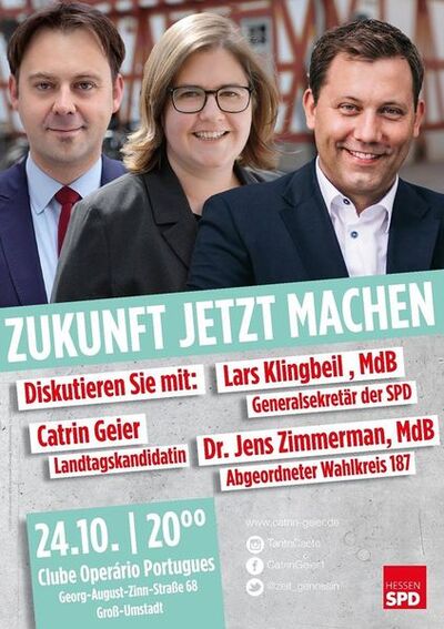 Stau auf unseren Straßen, steigende Mieten und Grundstückspreise, leerstehende Geschäfte in den Dörfern: obwohl es Hessen wirtschaftlich gut geht, ist das die Realität für viele Menschen. Das muss sich ändern, denn Hessen kann mehr. Was die SPD für gute Bildung, ausgebaute Verkehrswege und lebenswerte Dörfer in Hessen tun möchte, darum geht es bei der Veranstaltung „Zukunft jetzt machen!“ am Mittwoch, 24. Oktober um 20 Uhr im Clube Operário Portugues (Georg-August-Zinn-Str. 68) in Groß-Umstadt. Es diskutieren Dr. Jens Zimmermann (Bundestagsabgeordneter) und Catrin Geier (Landtagskandidatin im Wahlkreis 52). Als besonderer Gast wird der Generalsekretär der Bundes-SPD Lars Klingbeil vor Ort sein und im TownHall Format direkt Fragen aus dem Publikum beantworten.